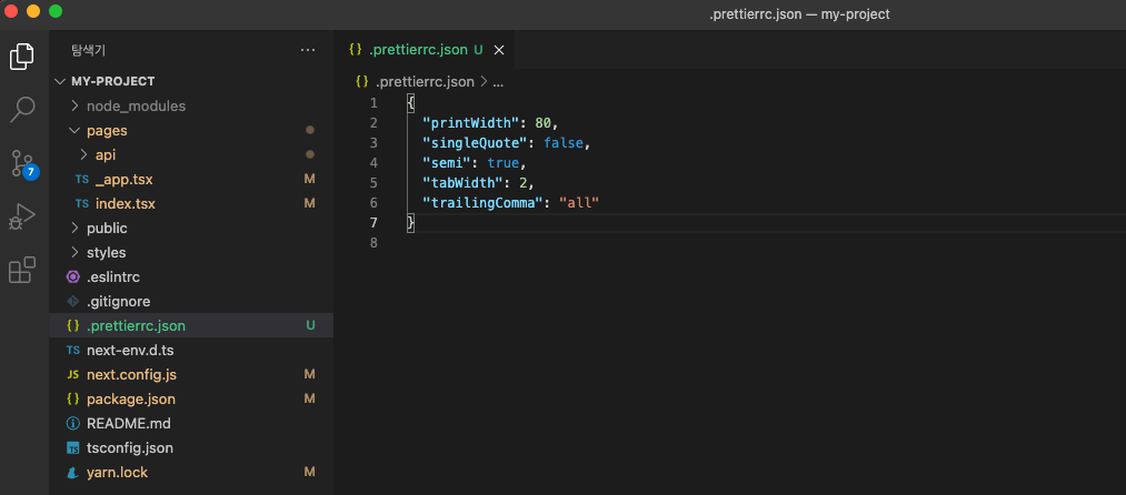 "my-project"로 project 이름을 정해주었습니다.node_modules는 yarn 실행시 생기는 것으로 삭제해도 yarn을 실행하면 생성됩니다.visual studio 에서 prettierrc.json 파일을 만들고 아래를 입력합니다. http: