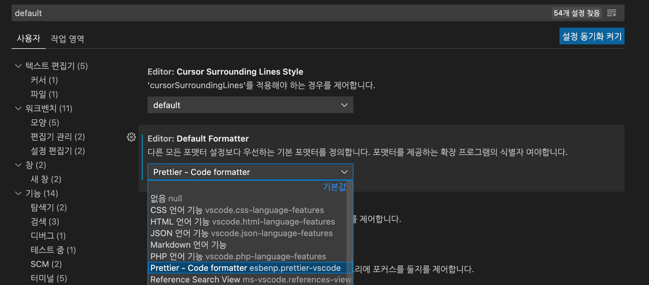 여기서 default를 검색하여 Default Formatter을 Pretteir로 설정해주고, save를 검색하여 Format On Save에 체크를 해줍니다.