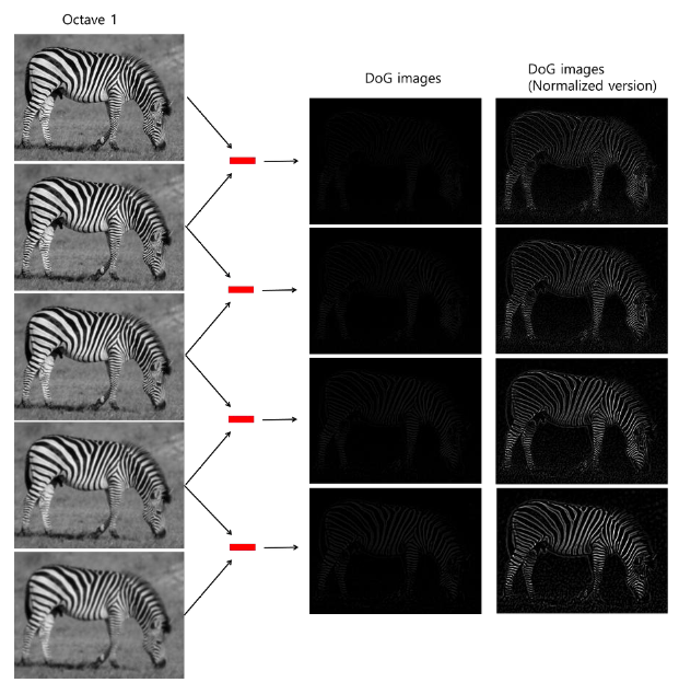 - 각 scale 단계에서, 인접한 블러 이미지끼리 빼서 Difference of Gaussian (DoG) 이미지 생성.