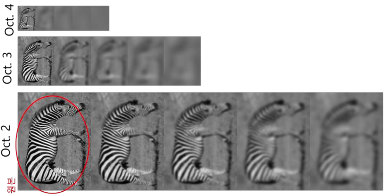 - 각 scale마다, 가우시안 블러를 다양하게 적용 (\( \sigma \) 조정)